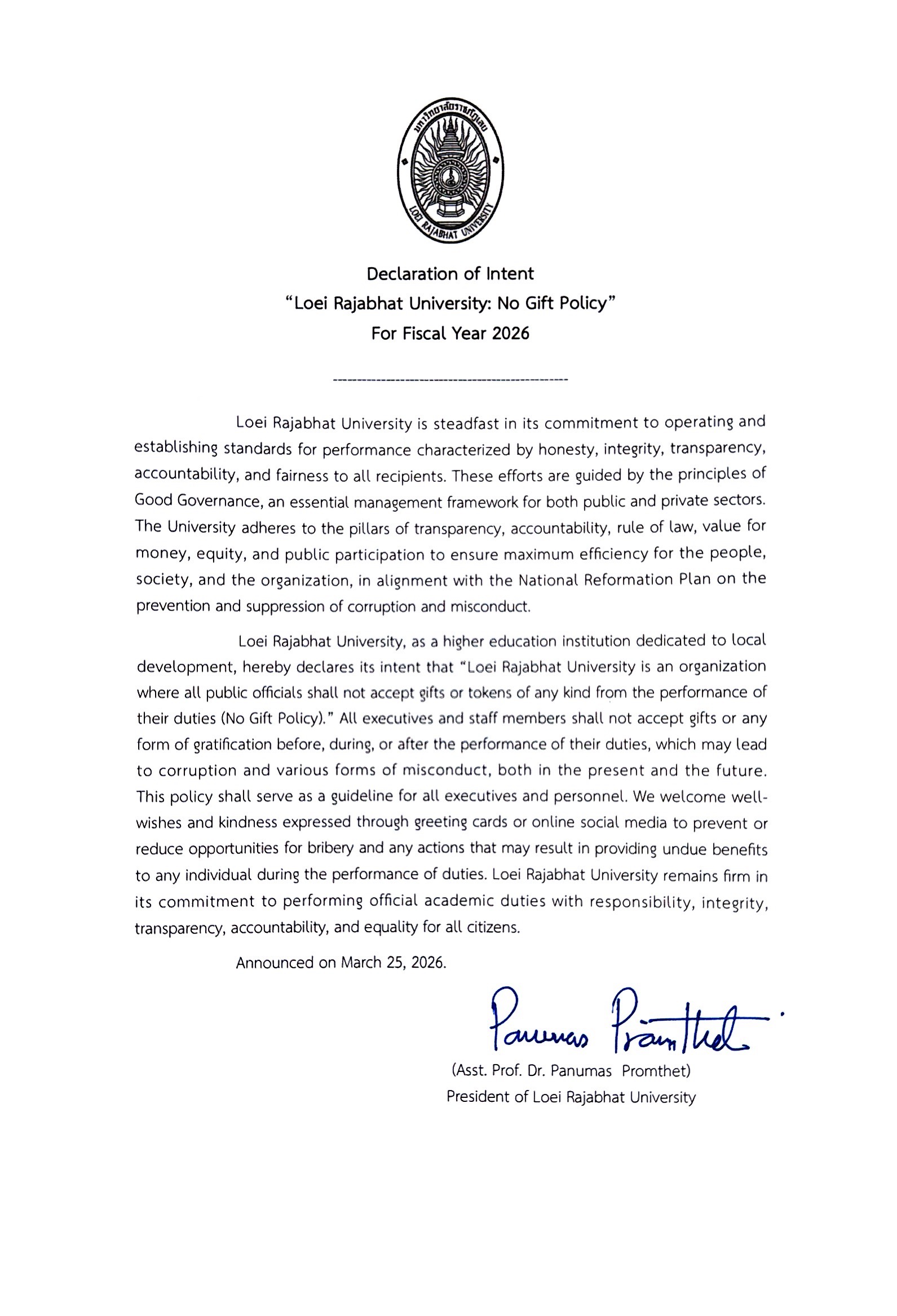 ม.ราชภัฏเลย ประกาศนโยบายไม่ให้ไม่รับ NO GIF POLICY 2569