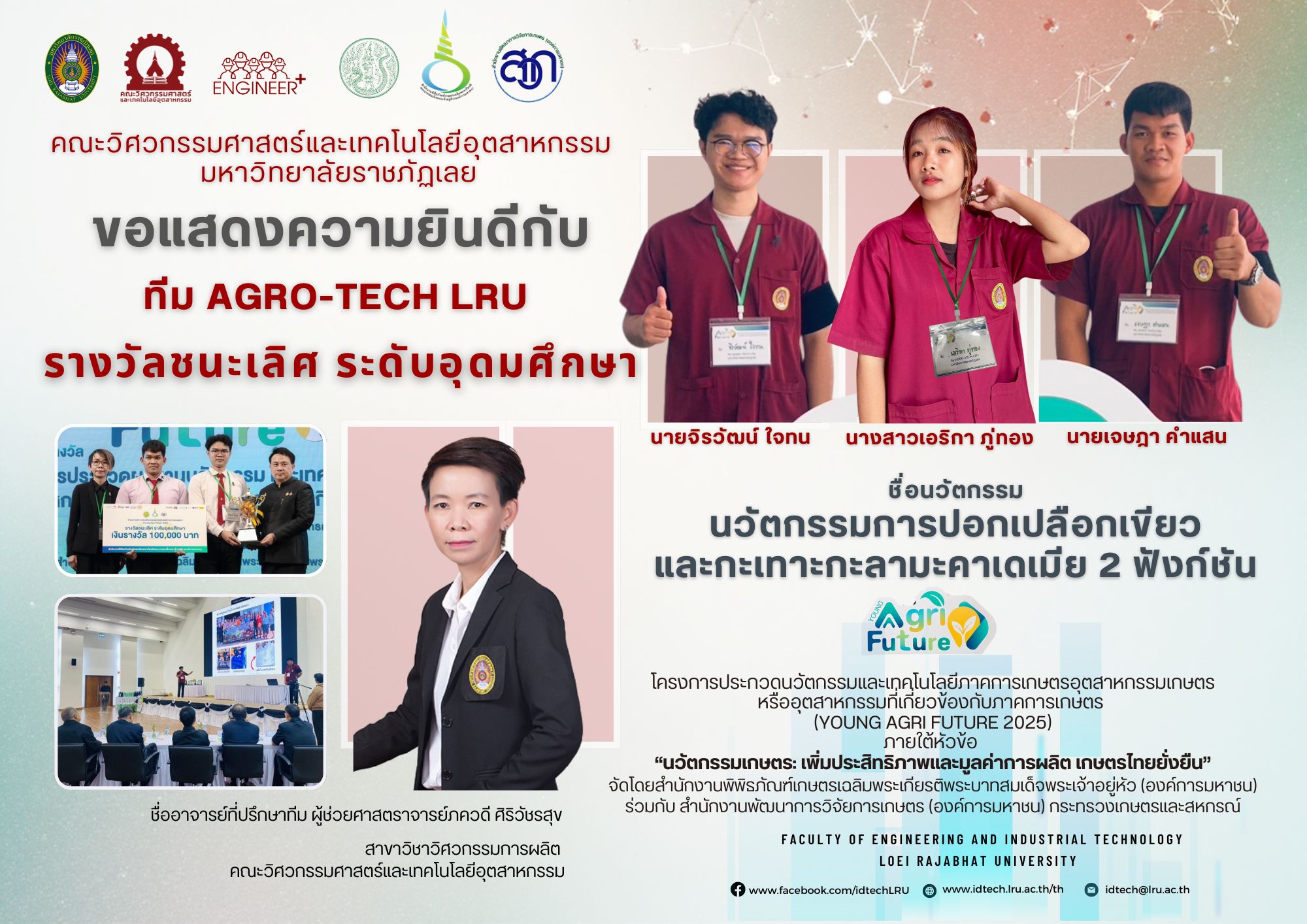 นักศึกษาคณะวิศวกรรมศาสตร์และเทคโนโลยีอุตสาหกรรม มหาวิทยาลัยราชภัฏเลย คว้ารางวัลชนะเลิศ ระดับอุดมศึกษา โครงการประกวดนวัตกรรมและเทคโนโลยีภาคการเกษตร อุตสาหกรรมเกษตร หรืออุตสาหกรรมที่เกี่ยวข้องกับภาคการเกษตร (YOUNG AGRI FUTURE 2025) ภายใต้หัวข้อ “นวัตกรรมเกษตร: เพิ่มประสิทธิภาพและมูลค่าการผลิต เกษตรไทยยั่งยืน”