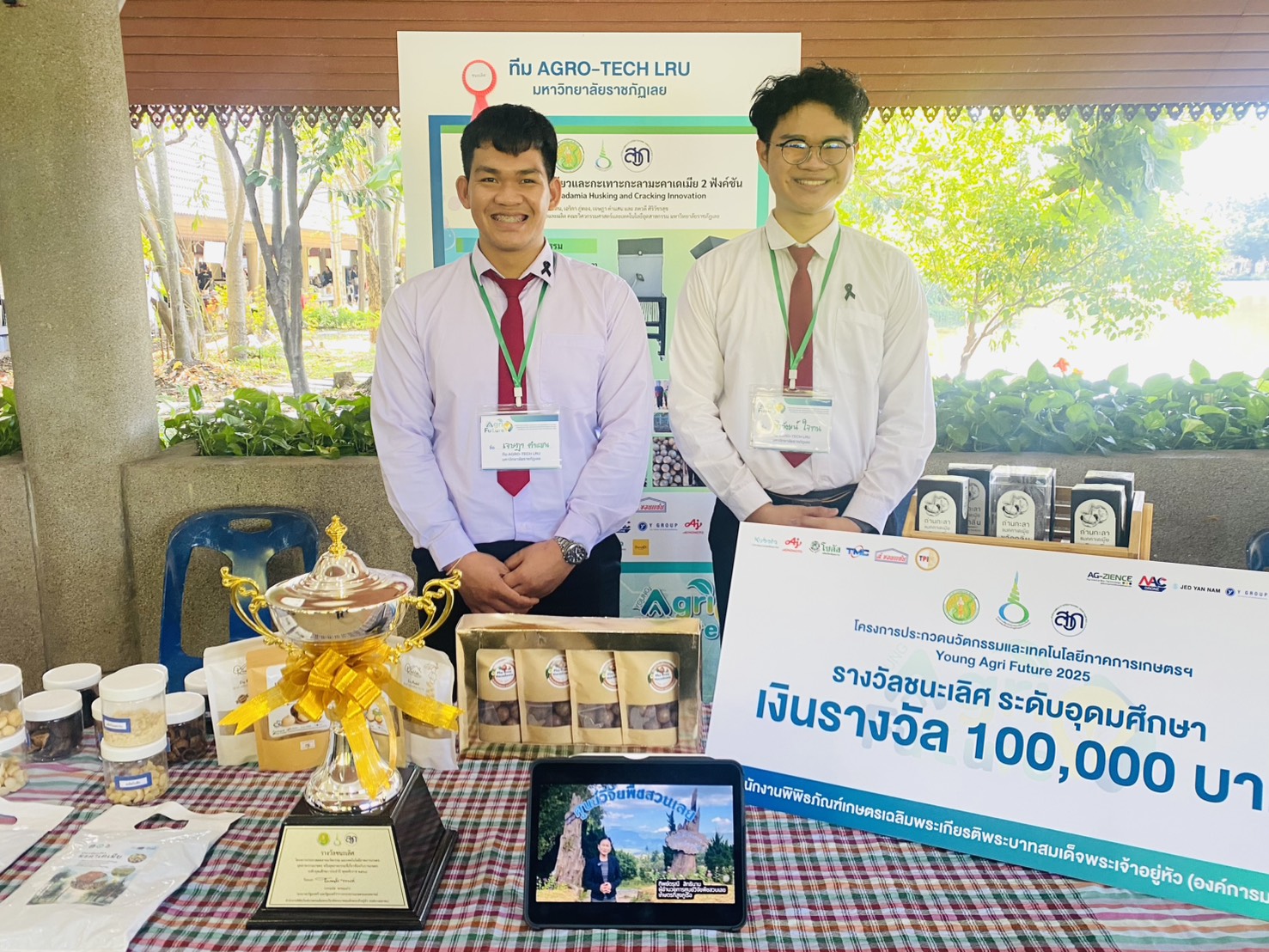 ผลการการแข่งขัน ทีม AGRO-TECH LRU มหาวิทยาลัยราชภัฏเลย คว้ารางวัลชนะเลิศ ด้วยผลงาน นวัตกรรมการปอกเปลือกเขียวและกะเทาะกะลามะคาเดเมีย 2 ฟังก์ชัน รับเงินรางวัล 100,000 บาทพร้อมถ้วยรางวัล ประกอบด้วย นายจิรวัฒน์ ใจทน หมู่เรียน วศ. 6502 นางสาวเอริกา ภู่ทอง หมู่เรียน วศ.6502 นายเจษฎา คำแสน หมู่เรียน วศ.6603T อาจารย์ที่ปรึกษา ผู้ช่วยศาสตราจารย์ภควดี ศิริวัชรสุข คณะวิศวกรรมศาสตร์และเทคโนโลยีอุตสาหกรรม มหาวิทยาลัยราชภัฏเลย