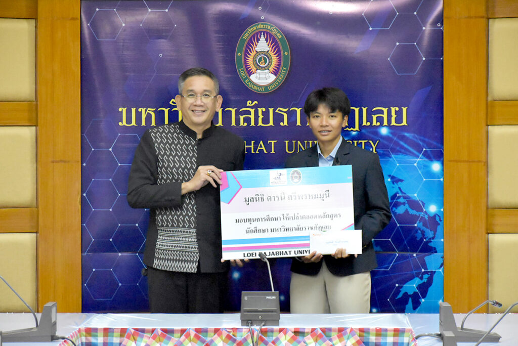 ผู้ช่วยศาสตราจารย์ ดร.ภาณุมาศ พรหมเทศ อธิการบดีมหาวิทยาลัยราชภัฏเลย มอบทุนการศึกษามูลนิธิดารนี ศรีพรหมมุนี เรียนฟรีตลอดหลักสููตร แก่ นางสาวสลิลดา มุงคล นักศึกษาชั้นปีที่ 3 สาขาวิชาพลศึกษา คณะครุศาสตร์ นักศึกษามหาวิทยาลัยราชภัฏเลย